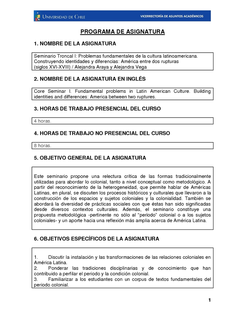 FH060186-1 Problemas Fundamentales de la Cultura Latinoamericana. Construyendo Identidades y Diferencias: América entre Dos Rupturas (Siglos XVI-XVIII) 2015, Segundo Semestre