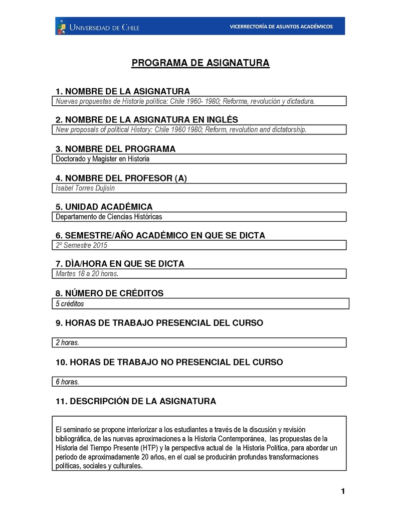 FH060380-1 Nuevas propuestas de Historia política: Chile 1960- 1980; Reforma, revolución y dictadura 2015, Segundo Semestre