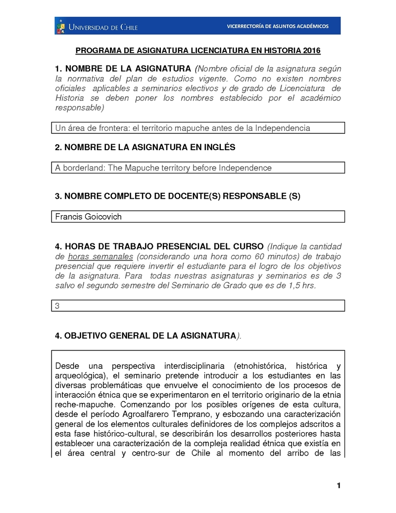 386301SE229-1 Un Área de Frontera: El Territorio Mapuche antes de la Independencia 2016, Segundo Semestre