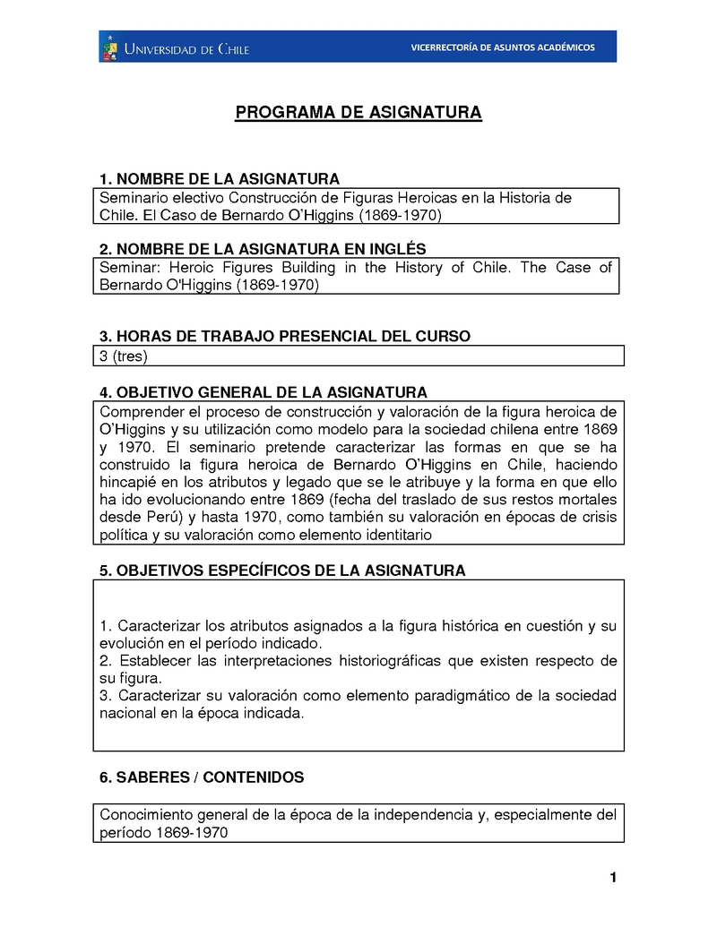 386301SE231-1 Construcción de figuras heroicas en la historia de Chile. El caso de Bernardo O"Higgins (1869-1970) 2016, Segundo Semestre