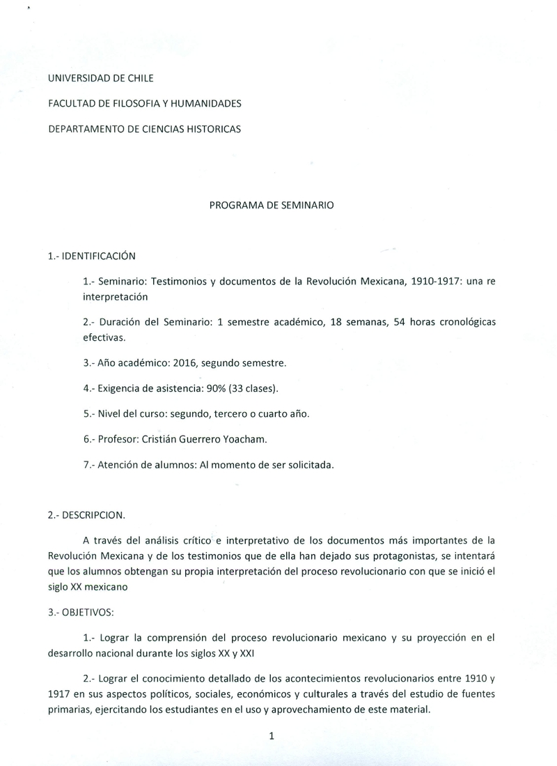 386301SE232-1 Testimonios y documentos de la revolución mexicana, 1910-1917. Una reinterpretación 2016, Segundo Semestre