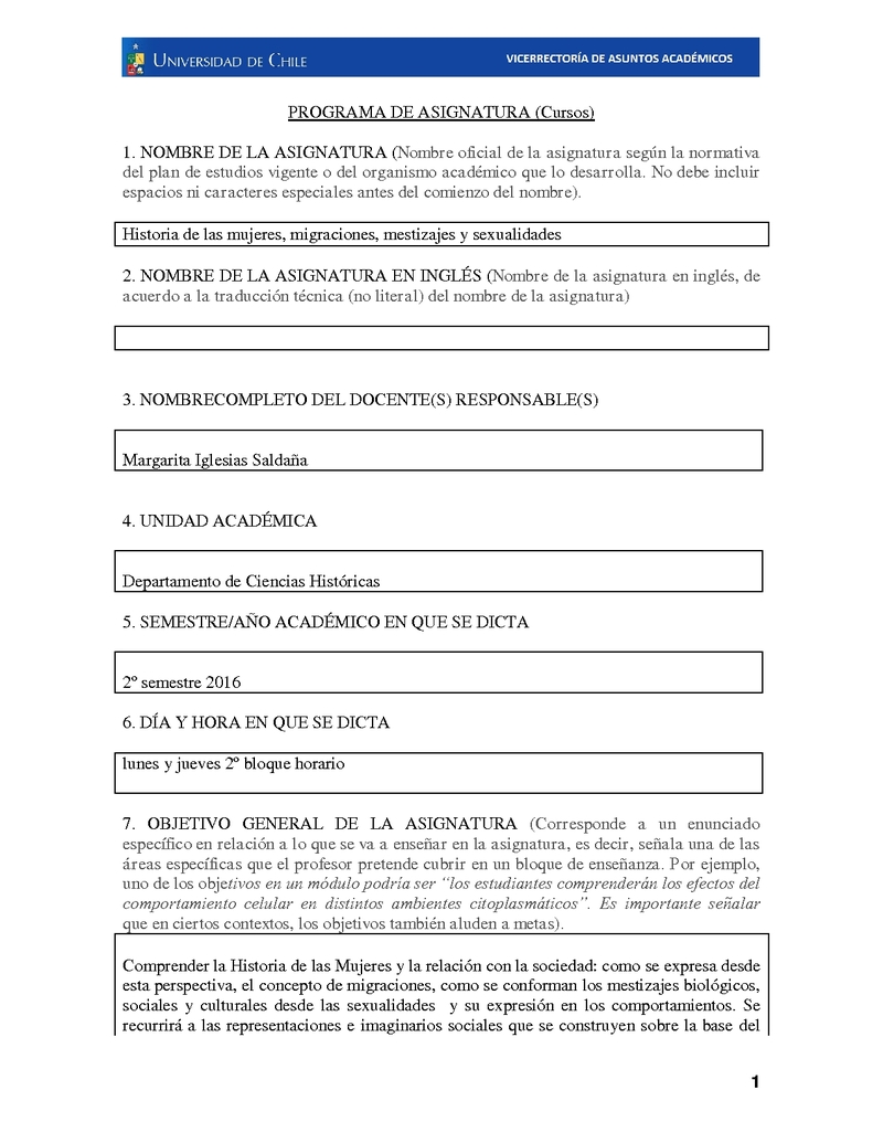 386301SE234-1 Historia de las mujeres, migraciones, mestizajes y sexualidades 2016, Segundo Semestre