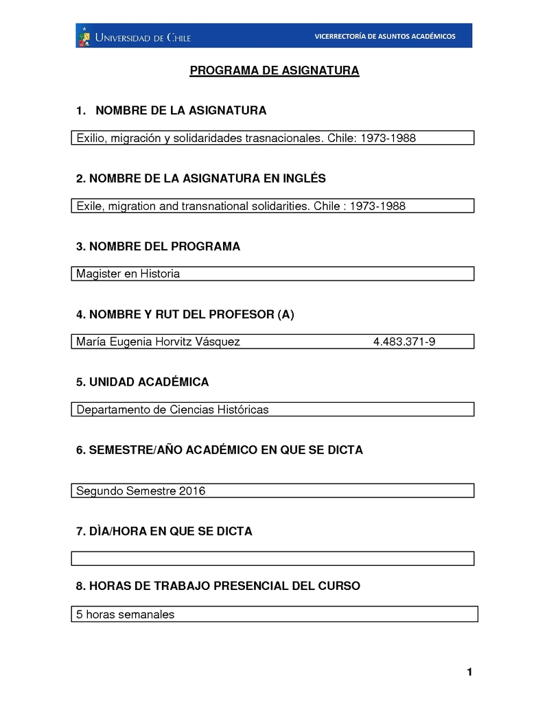 FH060410-1 Exilio, migración y solidaridades trasnacionales. Chile: 1973-1988 2016, Segundo Semestre