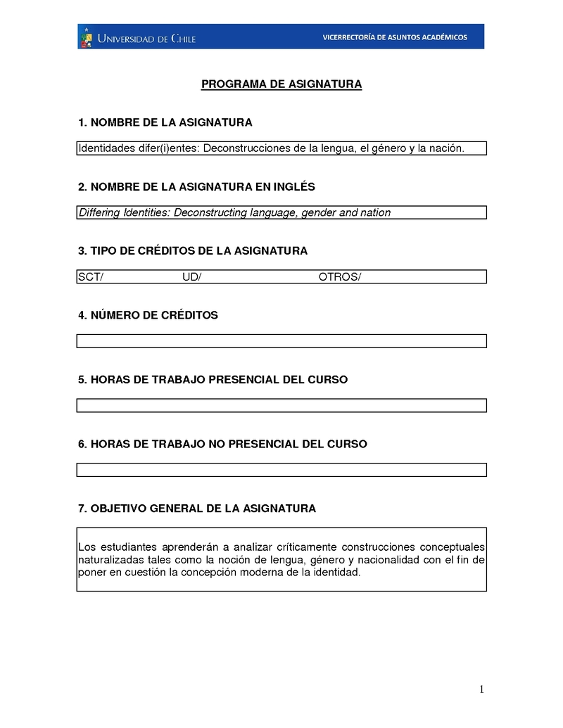 FH060481-1 Identidades difer(i)entes: deconstrucciones de la lengua, el género y la nación 2016, Segundo Semestre