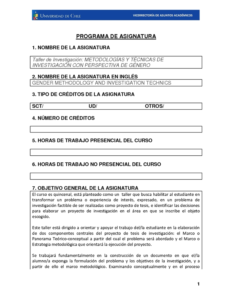 FH060496-1 Taller de Investigación: Metodologías y técnicas de investigación con perspectiva de género 2016, Segundo Semestre