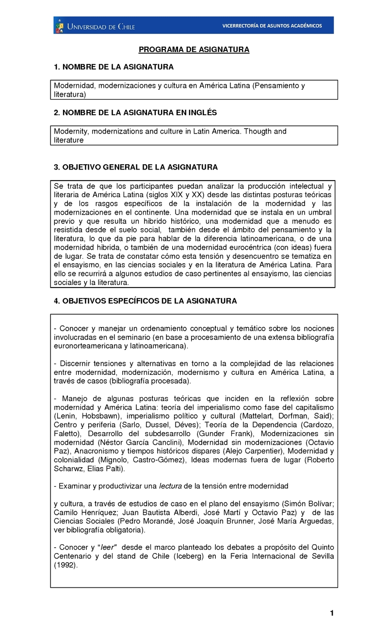 FH150052-1 Modernidad, modernizaciones y cultura en América Latina (Pensamiento y Literatura) 2016, Segundo Semestre