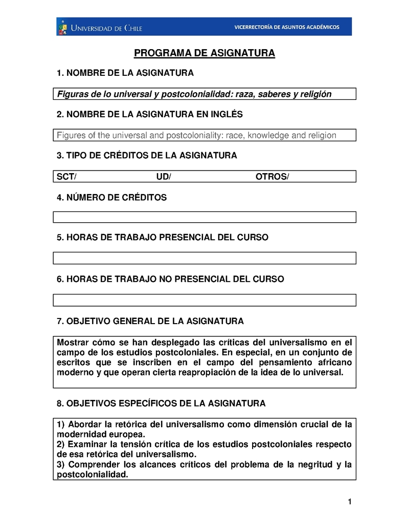 FH150097-1 Figuras de lo universal y postcolonialidad: raza, saberes y religión 2016, Segundo Semestre