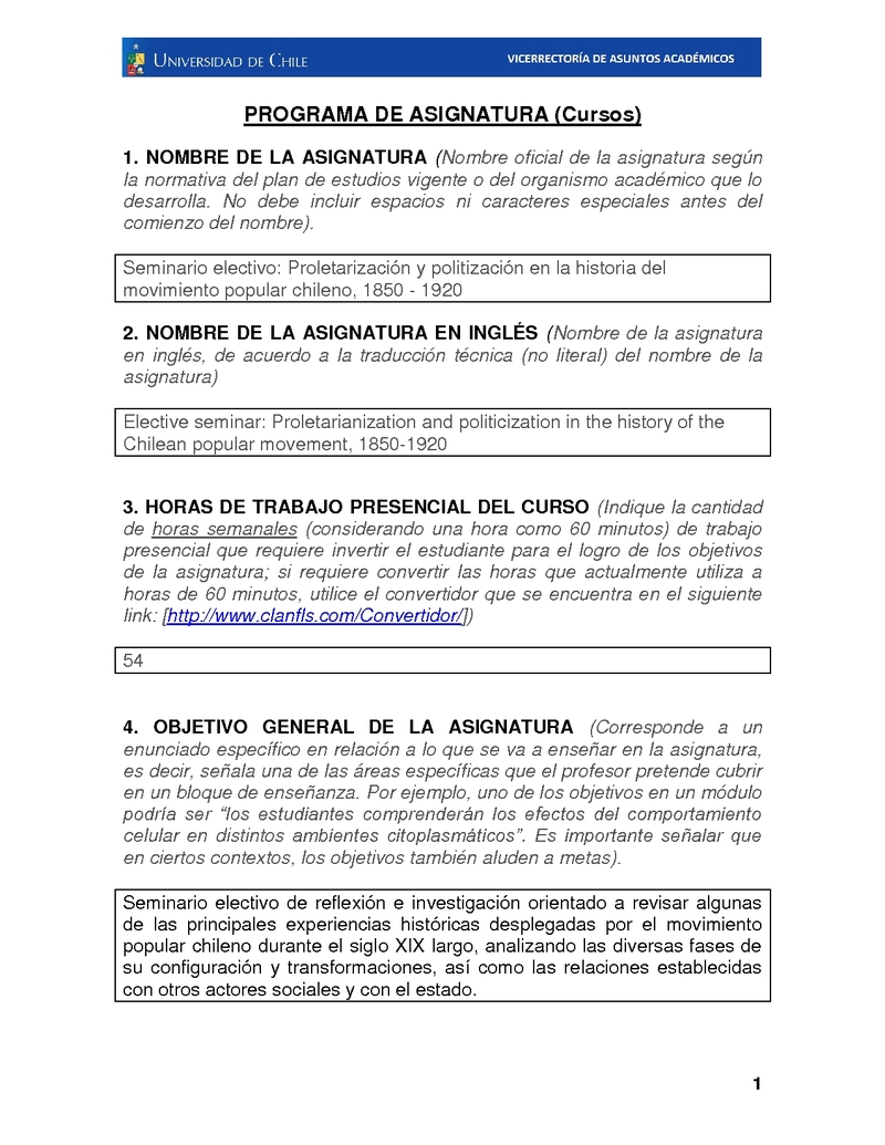 386301SE263-1 Proletarización y politización en la historia del movimiento popular Chileno, 1850-1920 2017, Segundo Semestre