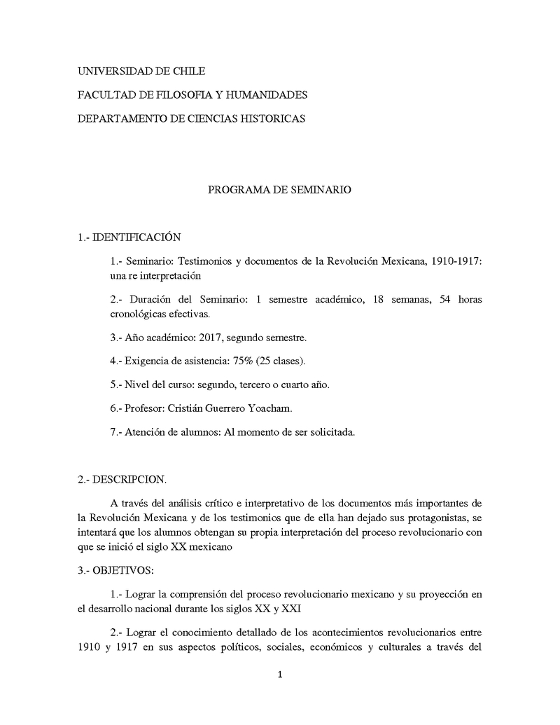 386301SE266-1 Documentos y Testimonios de la Revolución (1910-1917). Una reinterpretación. 2017, Segundo Semestre