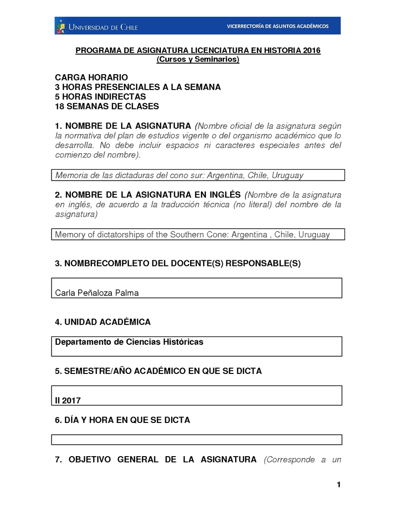 386301SE267-1 Memoria de las dictaduras del Cono Sur: Argentina,Chile,Uruguay 2017, Segundo Semestre