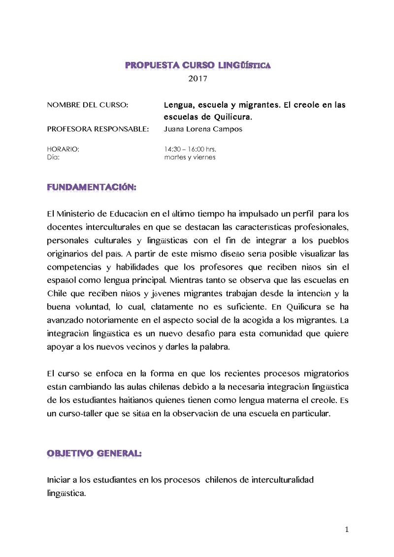 CBT0352-1 Lengua, escuela y migrantes. El creole en las escuelas de Quilicura. 2017, Segundo Semestre