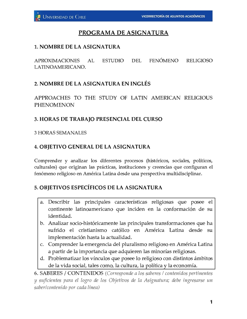 | Objetivos | OBJETIVO GENERAL: Comprender y analizar los diferentes procesos (históricos, sociales, políticos, culturales) que originan las prácticas, instituciones y creencias que configuran el fenómeno religioso en América Latina desde una perspectiva multidisciplinar. OBJETIVOS ESPECÍFICOS: a. Describir las principales características religiosas que posee el continente latinoamericano que inciden en la conformación de su identidad. b. Analizar socio-históricamente las principales transformaciones que ha sufrido el cristianismo católico en América Latina desde su implementación hasta la actualidad. c. Comprender la emergencia del pluralismo religioso en América Latina a partir de la importancia que adquieren las minorías religiosas. d. Problematizar los vínculos que posee lo religioso con distintos ámbitos de la vida social, tales como, la cultura, la política y la economía |