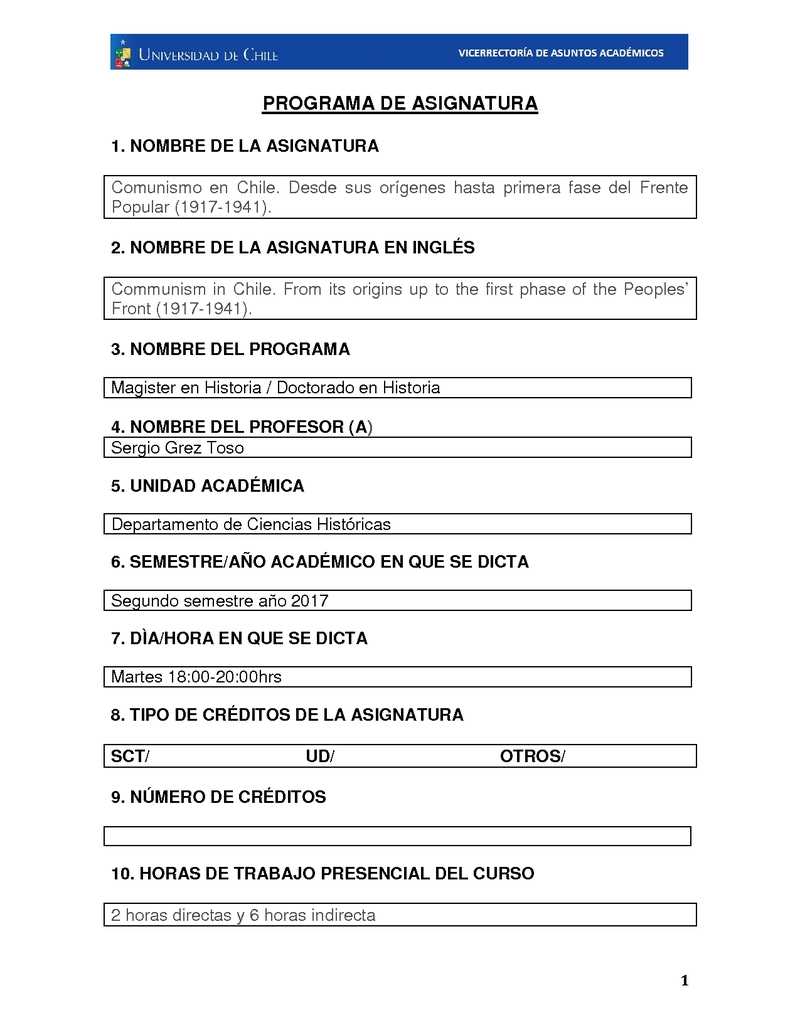 FH060489-1 Comunismo en Chile. Desde sus orígenes hasta primera fase del Frente Popular (1917-1941). 2017, Segundo Semestre
