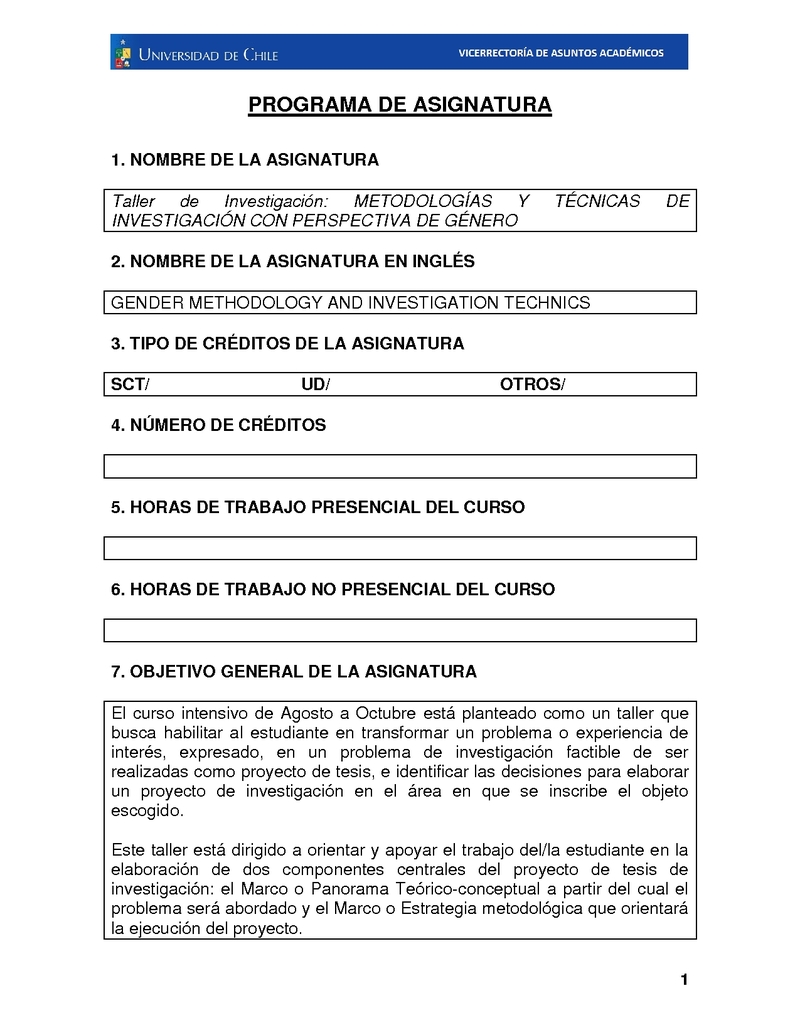 FH060496-1 Taller de Investigación: Metodologías y técnicas de investigación con perspectiva de género 2017, Segundo Semestre