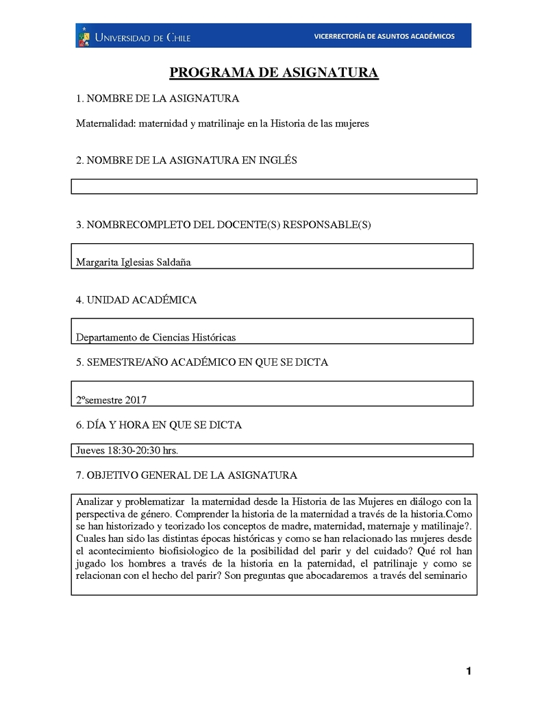FH060561-1 Maternalidad: maternidad y matrilinaje en la Historia de las mujeres 2017, Segundo Semestre