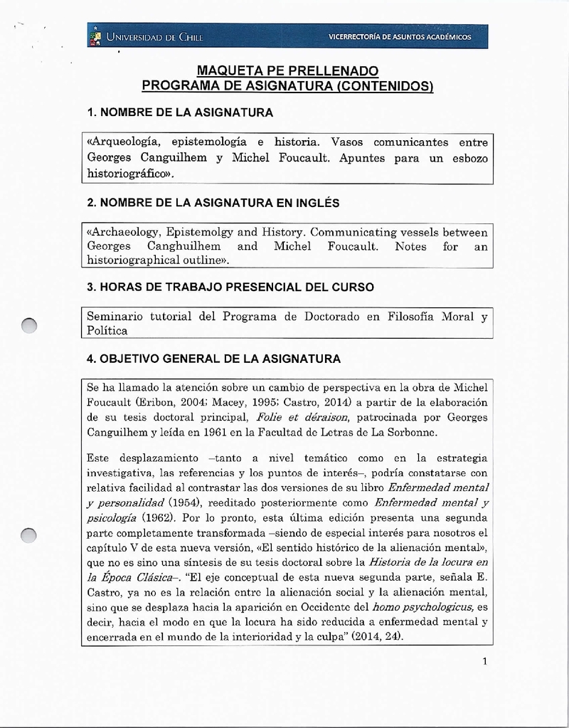 FH060574-1 Tutoría: Arqueología, epistemología e historia. Vasos comunicantes entre Georges Canguilhem y Michel Foucault. Apuntes para un esbozo historiográfico. 2017, Segundo Semestre