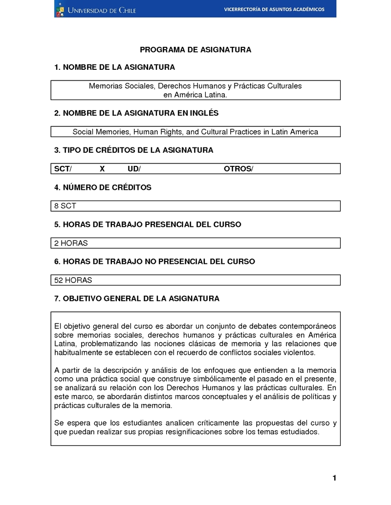 FH150140-1 Memoria, Derechos Humanos y producción cultural en América Latina 2017, Segundo Semestre