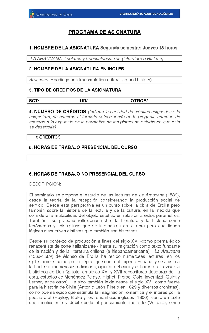 FH150141-1 LA ARAUCANA. Lecturas y transustanciación (Literatura e Historia). 2017, Segundo Semestre