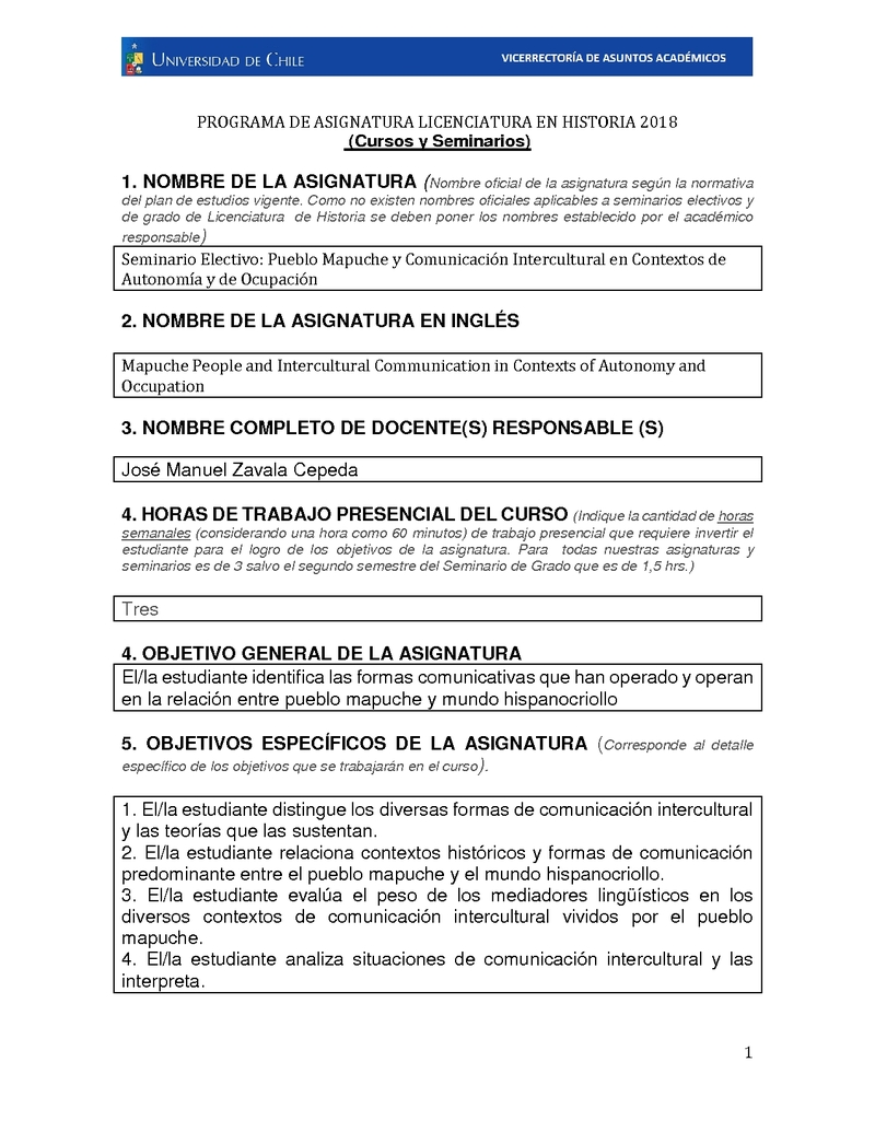 386301SE306-1 Pueblo Mapuche y comunicación intercultural en contextos de autonomía y de ocupación 2018, Segundo Semestre