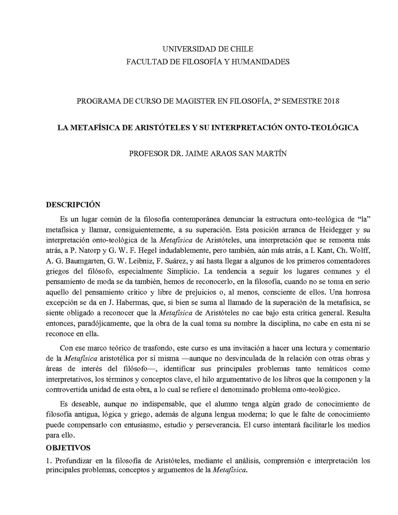FH060610-1 La Metafísica de Aristóteles y su interpretación Onto-Teológica 2018, Segundo Semestre