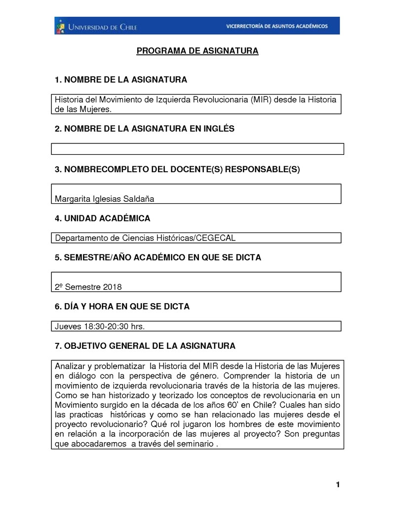 FH060618-1 Historia del Movimiento de Izquierda Revolucionaria (MIR) desde la Historia de las Mujeres 2018, Segundo Semestre