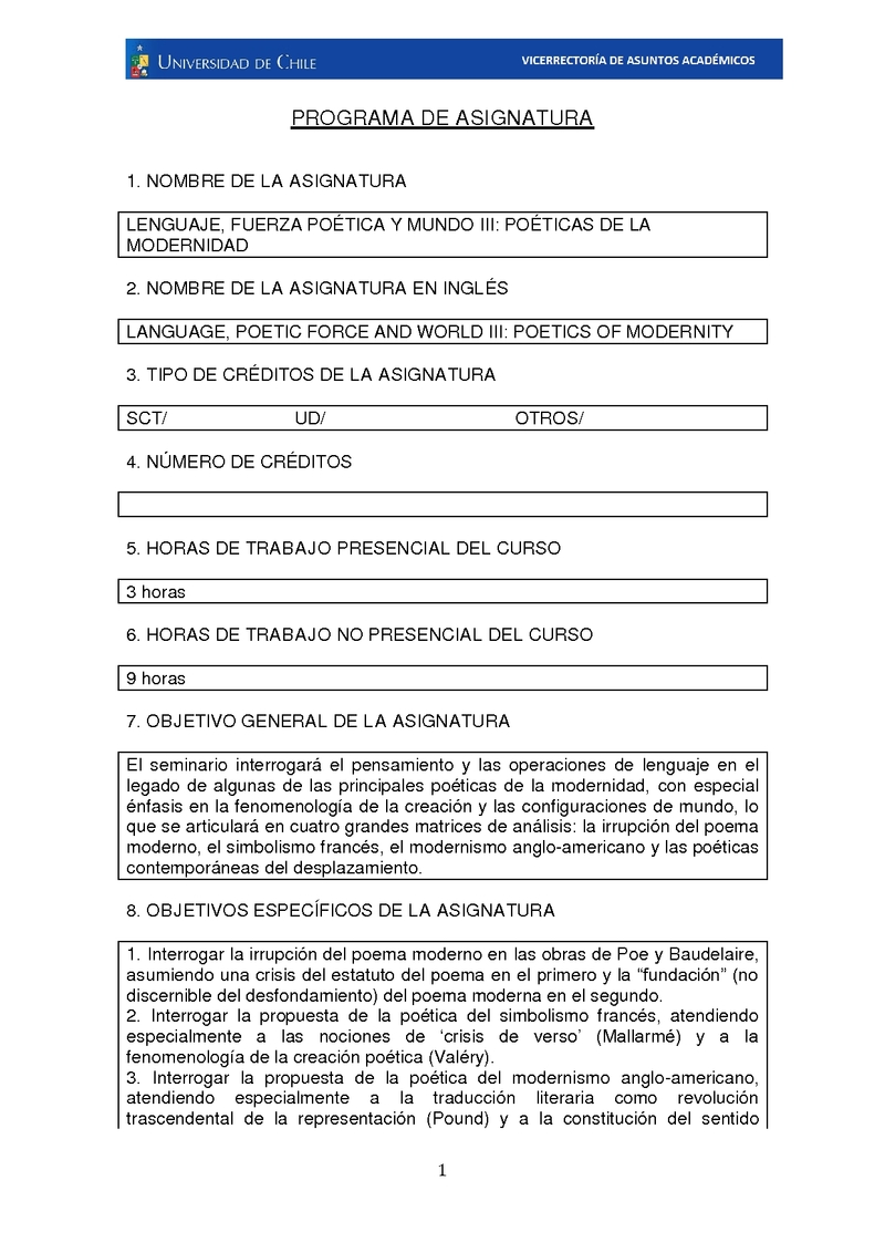 FH060620-1 Lenguaje, fuerza poética y Mundo III: Poéticas de la modernidad 2018, Segundo Semestre