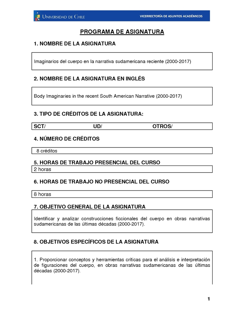 FH150197-1 Imaginarios del cuerpo en la narrativa sudamericana reciente (2000-2017) 2018, Segundo Semestre
