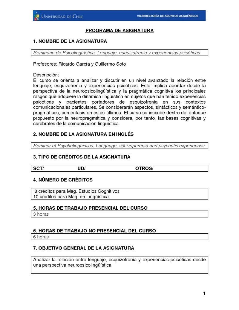 FH150220-1 Seminario de Psicolingüística: Lenguaje, esquizofrenia y experiencias psicóticas 2018, Segundo Semestre
