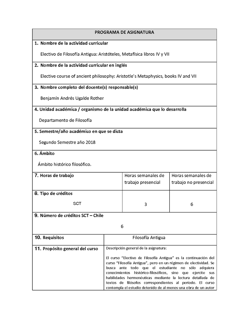 FIL02052-1 Electivo de Filosofía Antigua: Aristóteles, Metafísica libros IV y VII 2018, Segundo Semestre