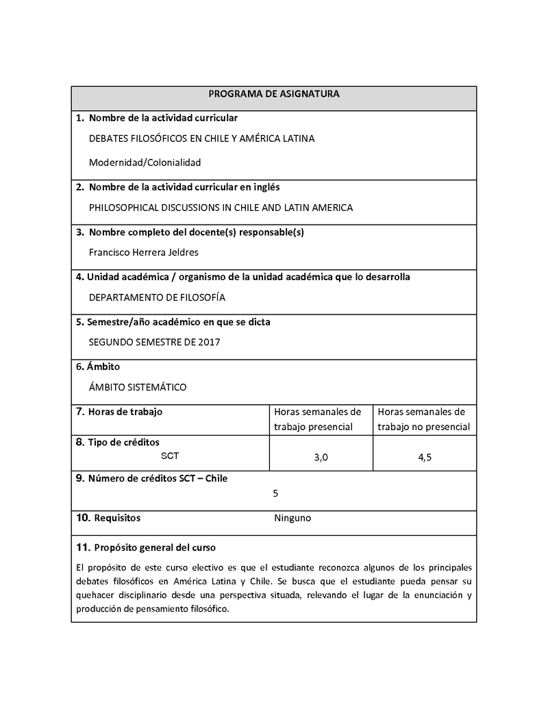 FIL04051-1 Debates filosóficos en Chile y América Latina: Modernidad/colonialidad 2018, Segundo Semestre