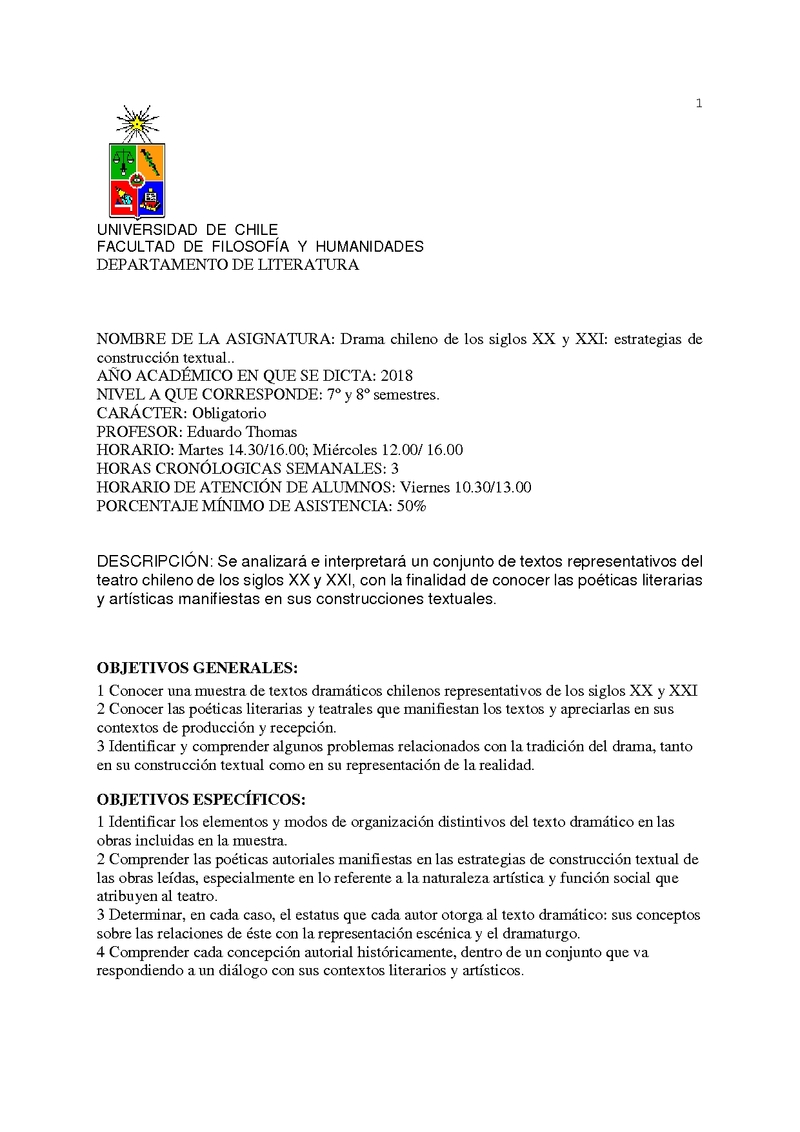 HISPLL012-1 Drama chileno de los siglos XX y XXI: estrategias de construcción textual 2018, Segundo Semestre