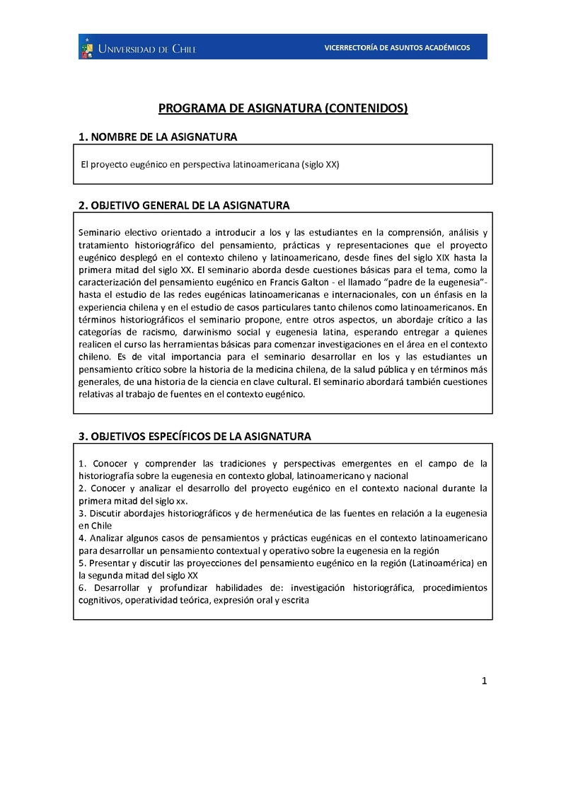 386301SE335-1 El proyecto eugénico en perspectivas latinoamericana, Siglo XX 2019, Primer Semestre