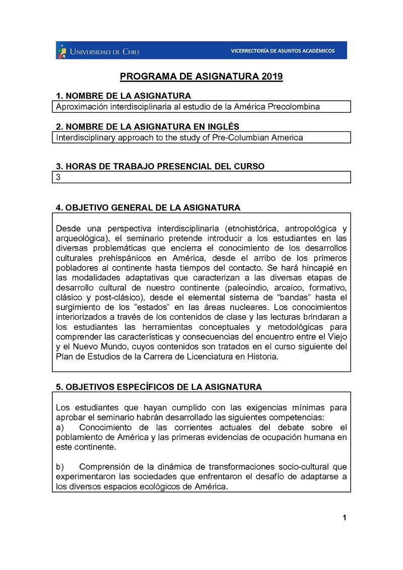386301SE346-1 Aproximación Interdisciplinaria al estudio de la América Precolombina 2019, Segundo Semestre
