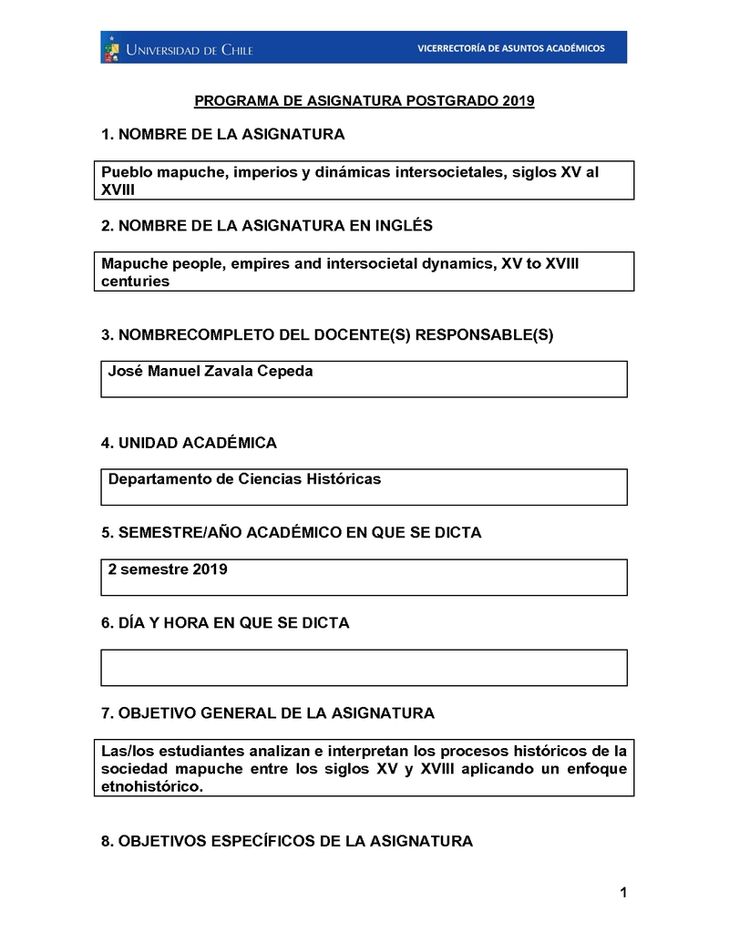 FH060683-1 Pueblo mapuche, imperios y dinámicas intersocietales, siglos XV al XVIII 2019, Segundo Semestre