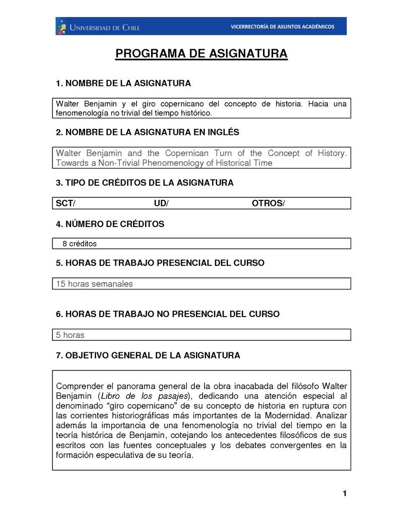 FH060688-1 Walter Benjamin y el giro copernicano del concepto de historia. Hacia una fenomenología no trivial del tiempo histórico. 2019, Segundo Semestre