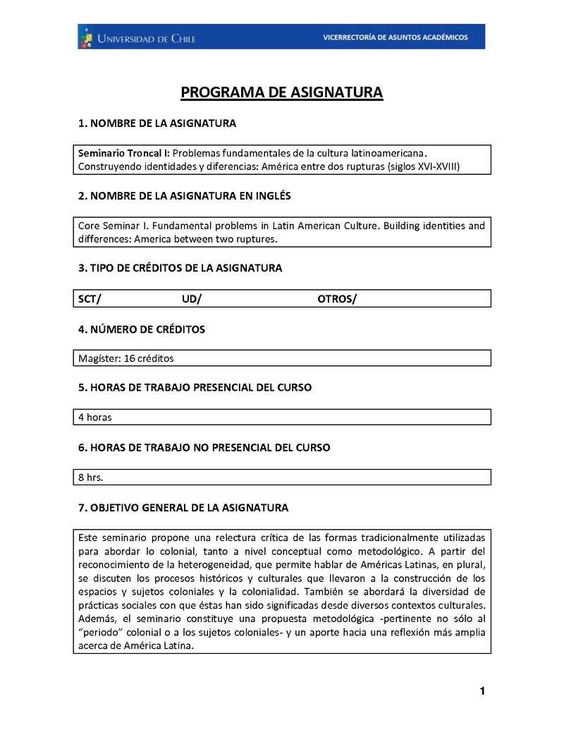 FH150196-1 Seminario Troncal I: Problemas fundamentales de la cultura latinoamericana. Construyendo identidades y diferencias: América entre dos rupturas (siglos XVI-XVIII) 2019, Segundo Semestre