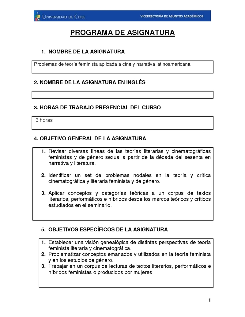 FH150320-1 Problemas de teoría feminista aplicada a cine y narrativa latinoamericana 2019, Segundo Semestre