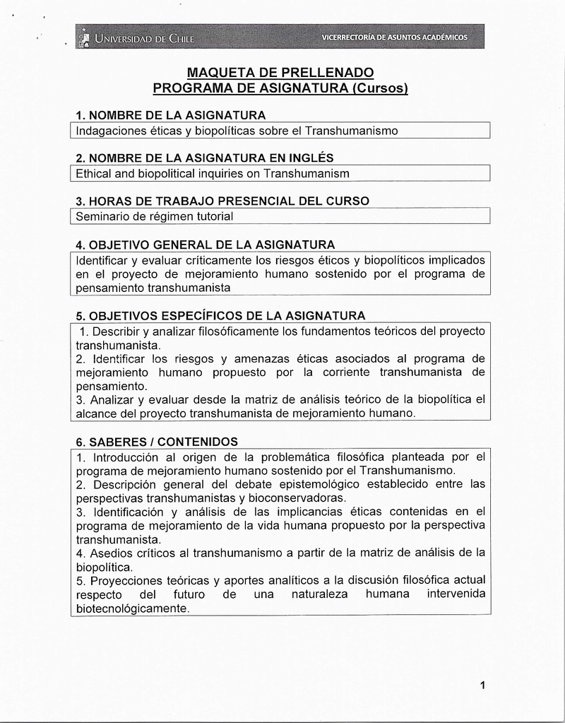 FH150363-1 Tutoría: Indagaciones éticas y biopolíticas sobre el Transhumanismo. 2019, Segundo Semestre