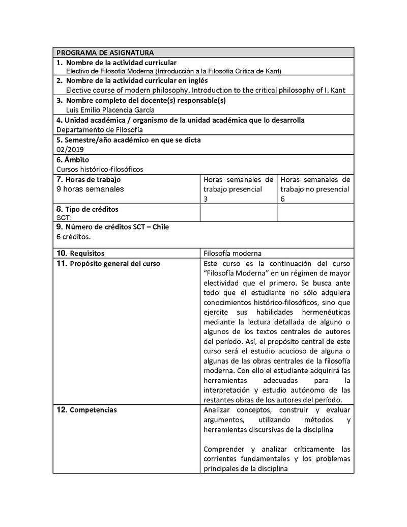 FIL0604-1 Electivo Filosofía Moderna, Introducción a la Filosofía Crítica de Kant 2019, Segundo Semestre