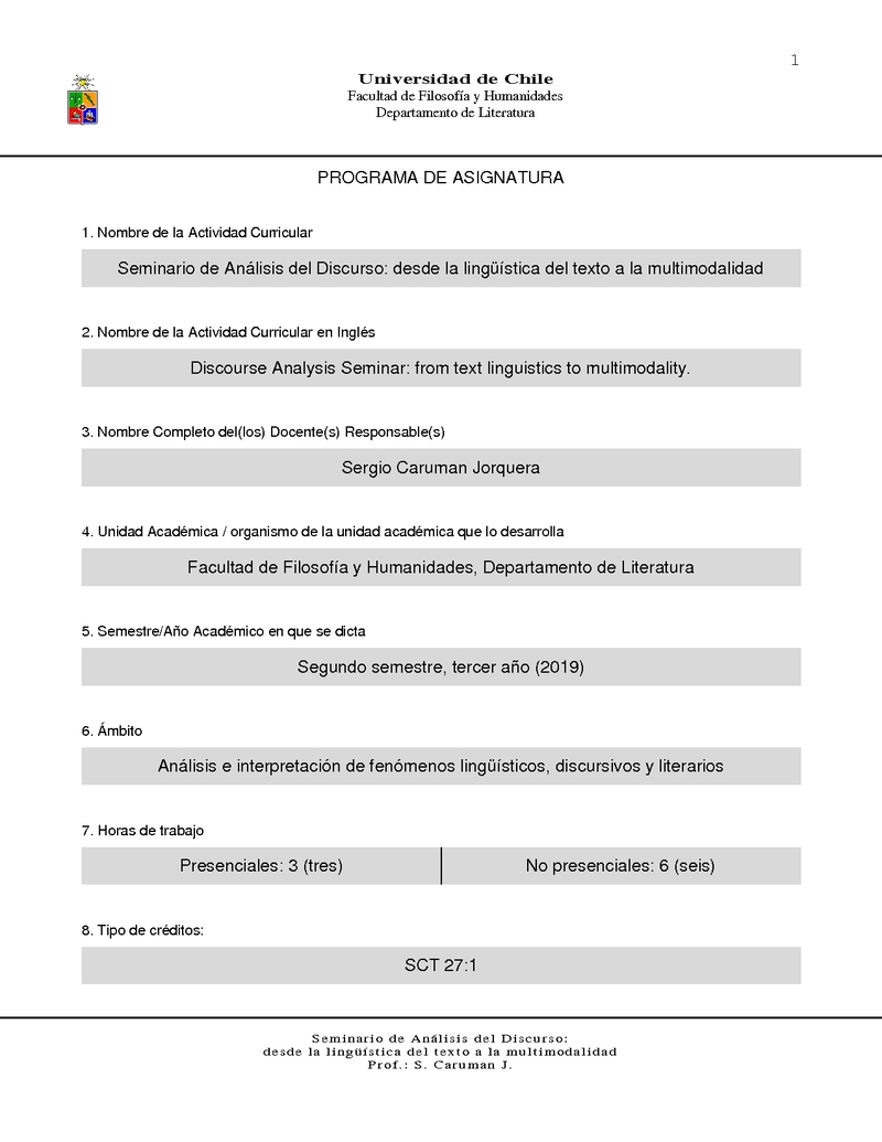 HISPTL006-1 Seminario de Análisis Del Discurso: De la Lingüística del Texto a la Multimodalidad 2019, Segundo Semestre
