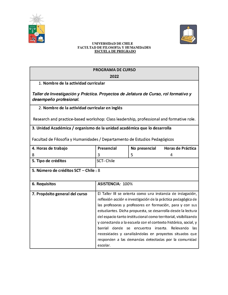38760301-3 Taller de Investigación y Práctica (III): Proyectos Jefatura de Curso, Rol Formativo y Desempeño Profesional 2022, Primer Semestre