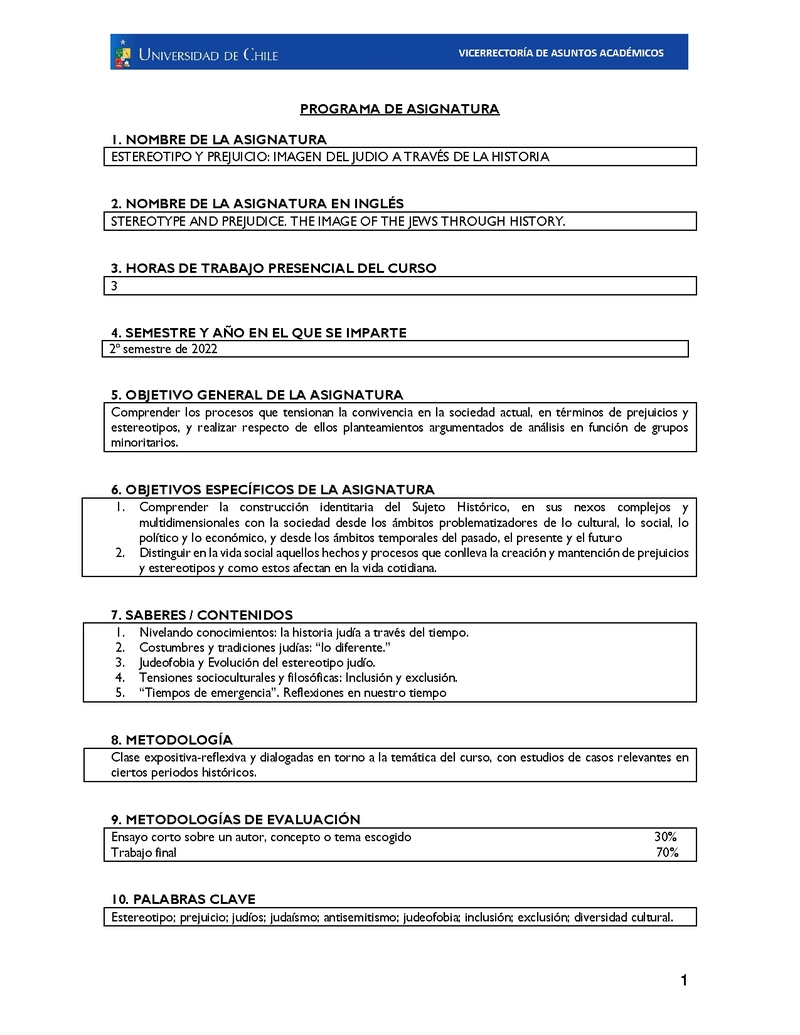 386301SE353-1 Estereotipo y Prejuicio: Imagen del Judío a través de la Historia 2022, Segundo Semestre