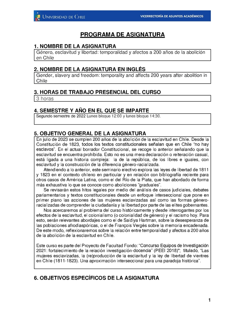 386301SE423-1 Género, esclavitud y libertad: temporalidad y afectos a 200 años de la abolición en Chile 2022, Segundo Semestre