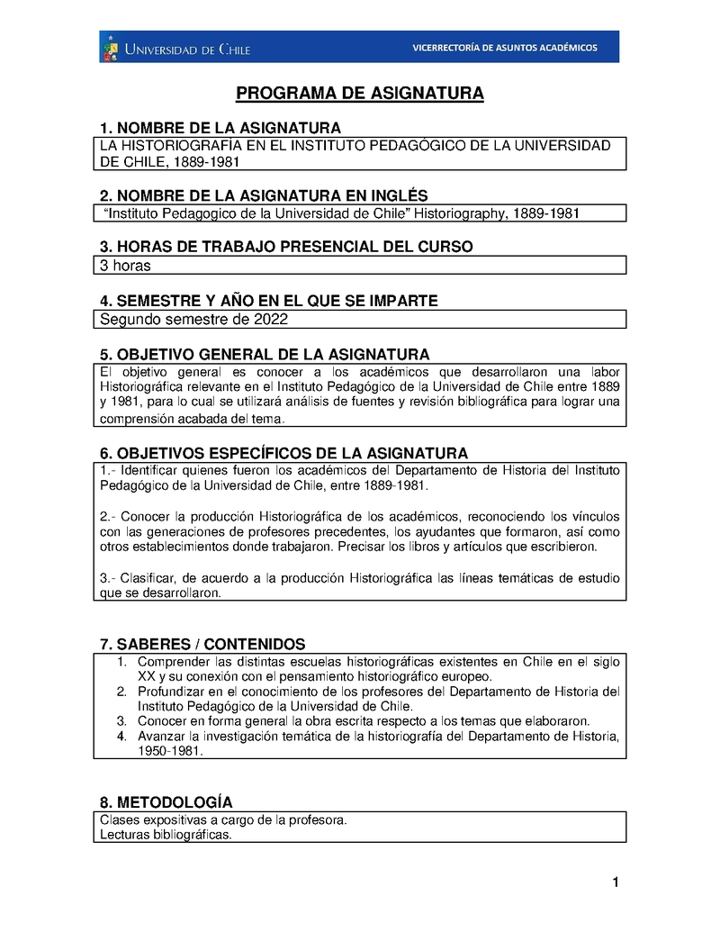 386301SE426-1 La Historiografía en el Instituto Pedagógico de la Universidad de chile, 1889-1981 2022, Segundo Semestre