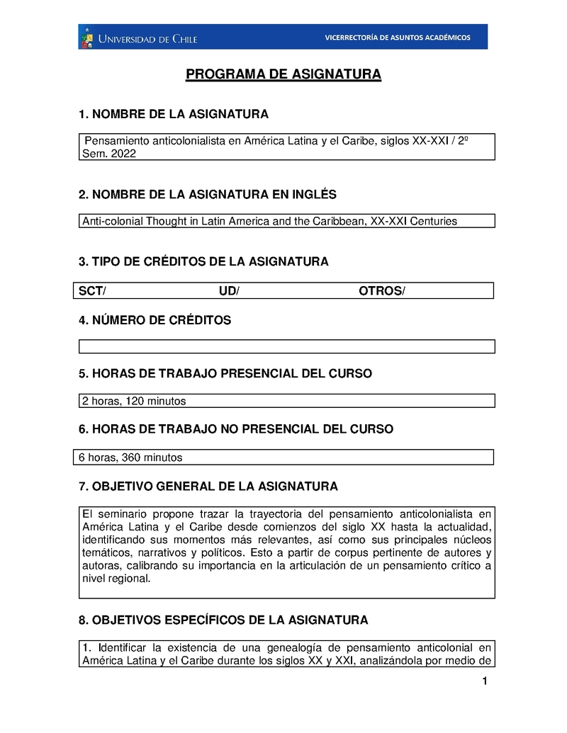 FH-DELA02002-1 Pensamiento anticolonialista en América Latina y el Caribe, siglos XX-XXI 2022, Segundo Semestre