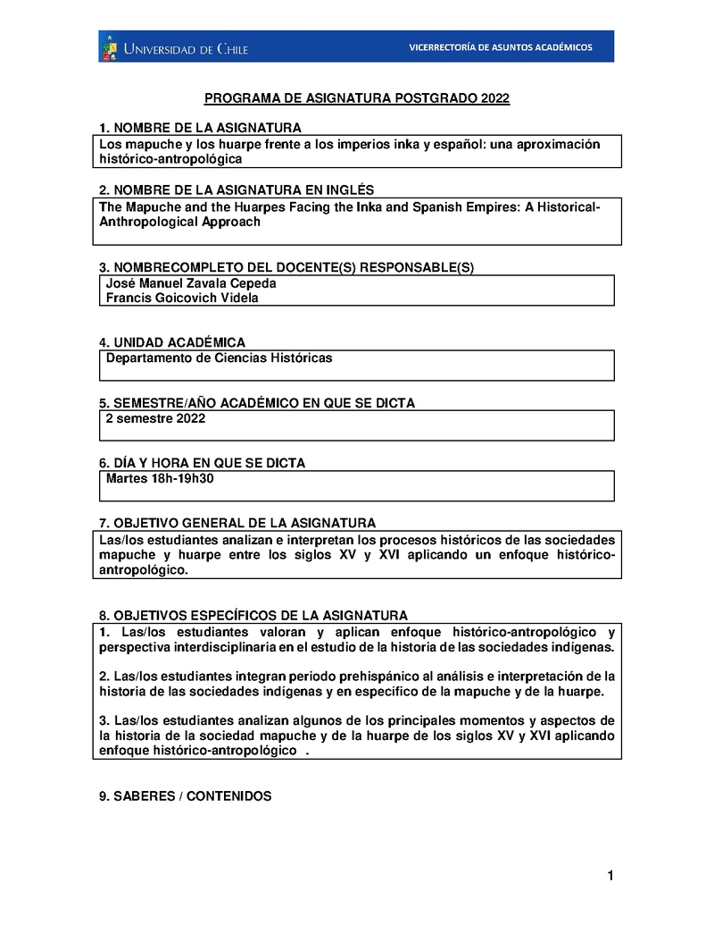 FH-DHIS01-202-1 Los mapuche y los huarpe frente a los imperios inka y español: una aproximación histórico-antropológica 2022, Segundo Semestre