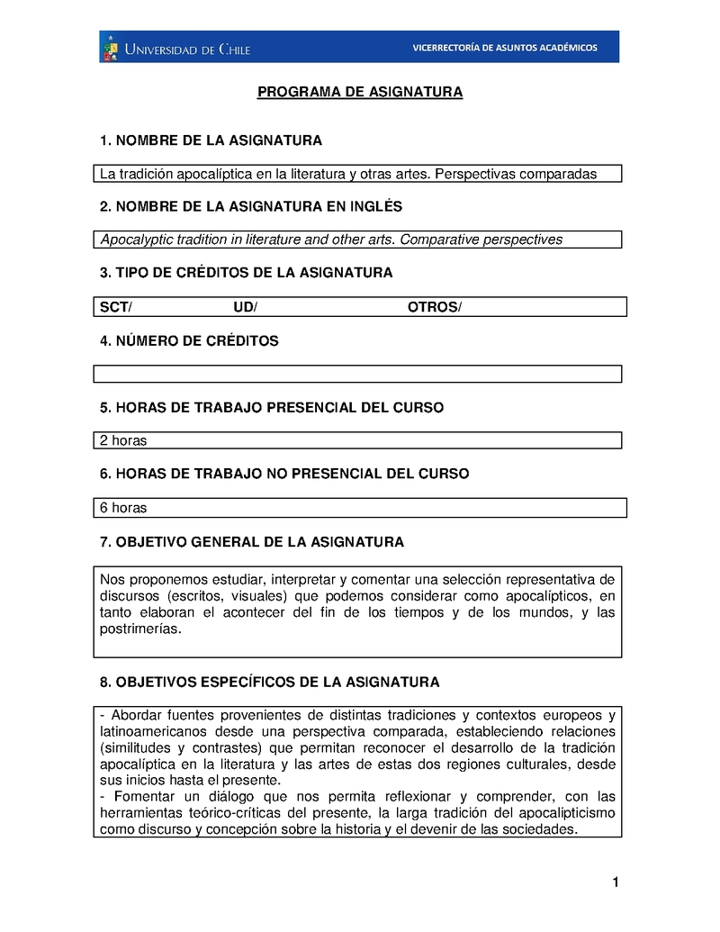 FH-DLIT001-1 La tradición apocalíptica en la literatura y otras artes. Perspectivas comparadas 2022, Segundo Semestre