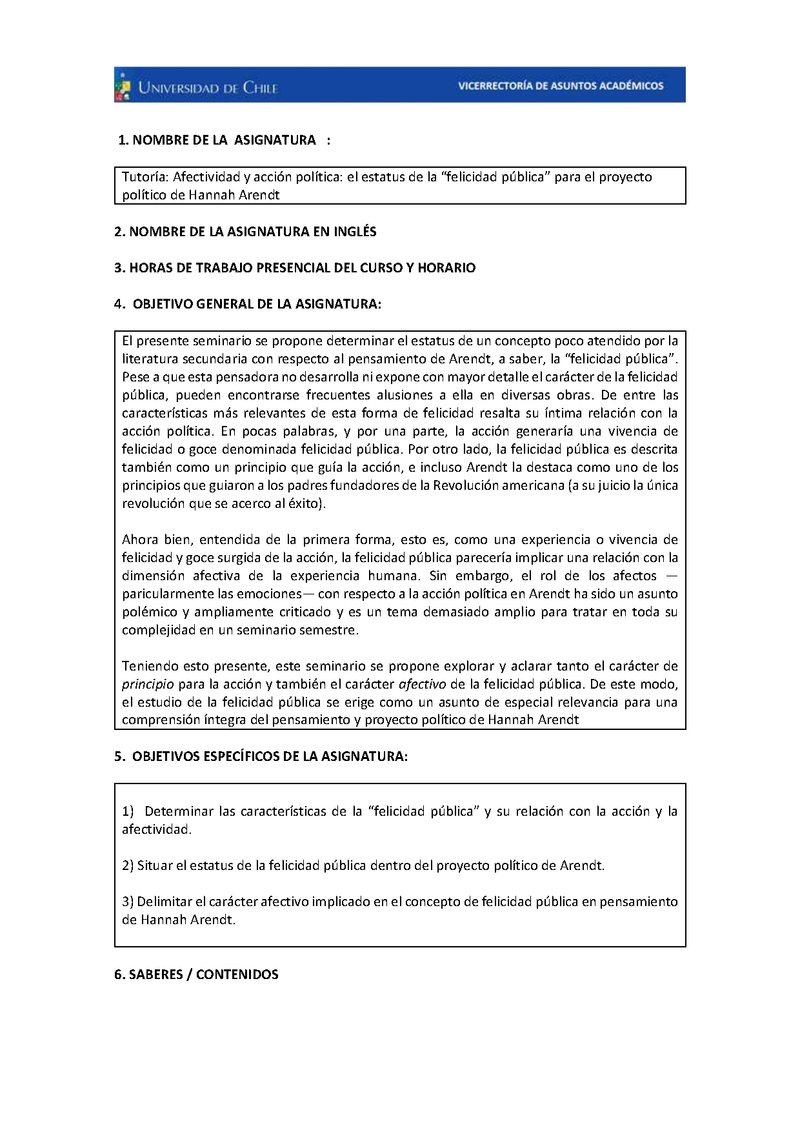 FH-MFIL02009-1 Tutoría: Afectividad y acción política: el estatus de la “felicidad pública” para el proyecto político de Hannah Arendt 2022, Segundo Semestre
