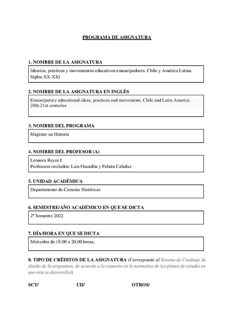 FH-MHIS04-401-1 Idearios, prácticas y movimientos educativos emancipadores. Chile y América Latina. Siglos XX-XXI 2022, Segundo Semestre