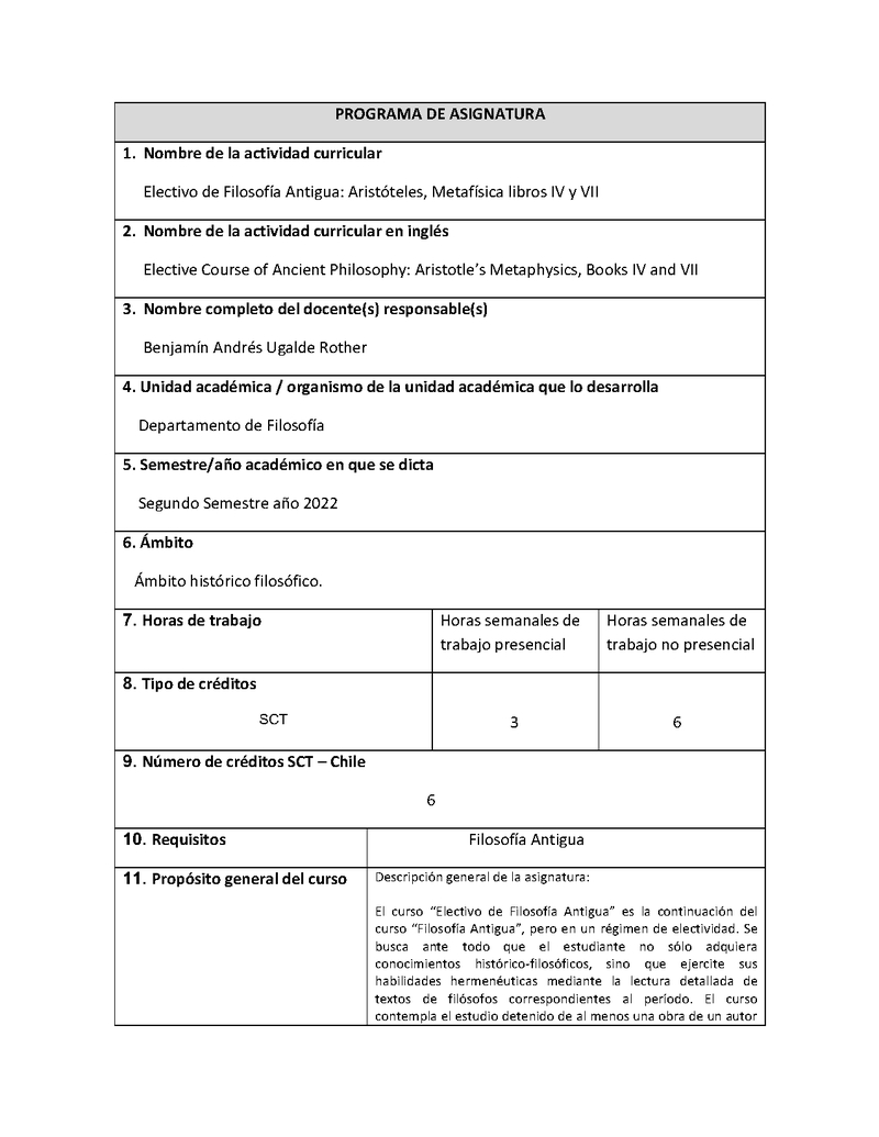 FIL02052-1 Electivo de Filosofía Antigua: Aristóteles, Metafísica libros IV y VII 2022, Segundo Semestre